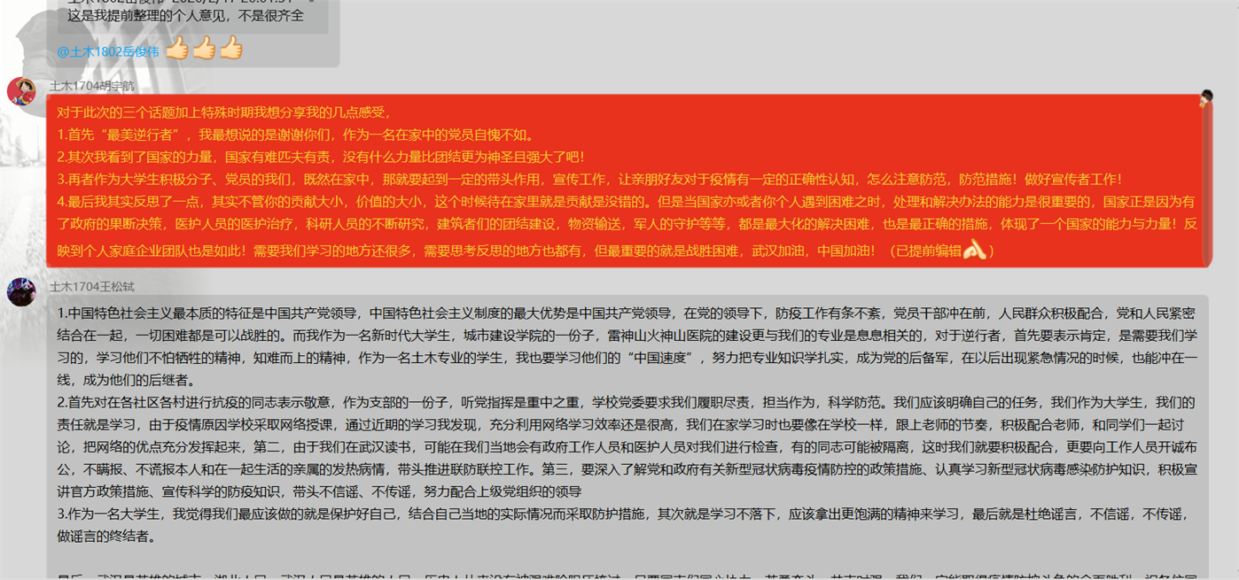 其中,入党积极分子成浩天同志也说:“每天看着新闻里的疫情变化,每天看着屏幕里白衣天使和病魔战斗的身影,对此我非常感谢和尊敬这次疫情战役中的最美逆行者,他们为了拯救一个个病人的生命,与时间赛跑,迎难而上,不惜牺牲自己,感谢你们。对于我自己来说,虽然我不能像他们一样去一线治病救人,但是我会老老实实呆在家里,保护好我的家人,不给国家添麻烦。现在的疫情逐渐好转,武汉加油,湖北加油,中国加油!”方召剑同志说到:“我们作为支部的一份子,可能帮不上什么大忙,但也要做好自己。不给组织添麻烦,勤洗手,出门戴口罩,对于不确定的信息我们不宣传,不造谣,众志成城共渡难关。我们作为当代大学生,积极响应此次工作,做好防护,锻炼好身体,尽量少出门,做一名负责任的公民。武汉加油,胜利终将属于我们。”