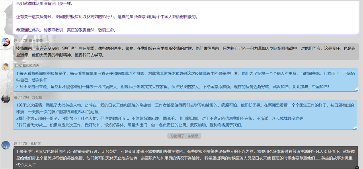据悉,本次活动旨在让积极分子和党员们都能意识到自己的责任与义务,并在保证自身安全的情况下,参与到防疫工作中,尽自己的一份力。本次学习讨论的活动在网络上进行,由杨骁同志主持,支部里的每一个同志都积极发言。其中,在个人感受发言环节,支部的党员胡宇航同志发表了自己的感想:“首先‘最美逆行者’,我最想说的是谢谢你们,谢谢你们的英勇无畏和无私奉献。其次我看到了国家的力量,国家有难匹夫有责,没有什么力量比团结更为神圣且强大了吧!作为大学生积极分子、党员的我们,既然在家中,那就要起到一定的带头作用,做好宣传工作,让亲朋好友对于疫情有一定的正确认知,了解注意防范措施。做好宣传者工作!”