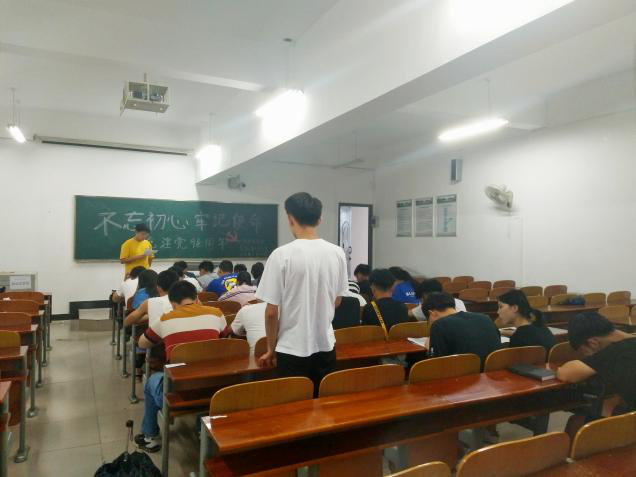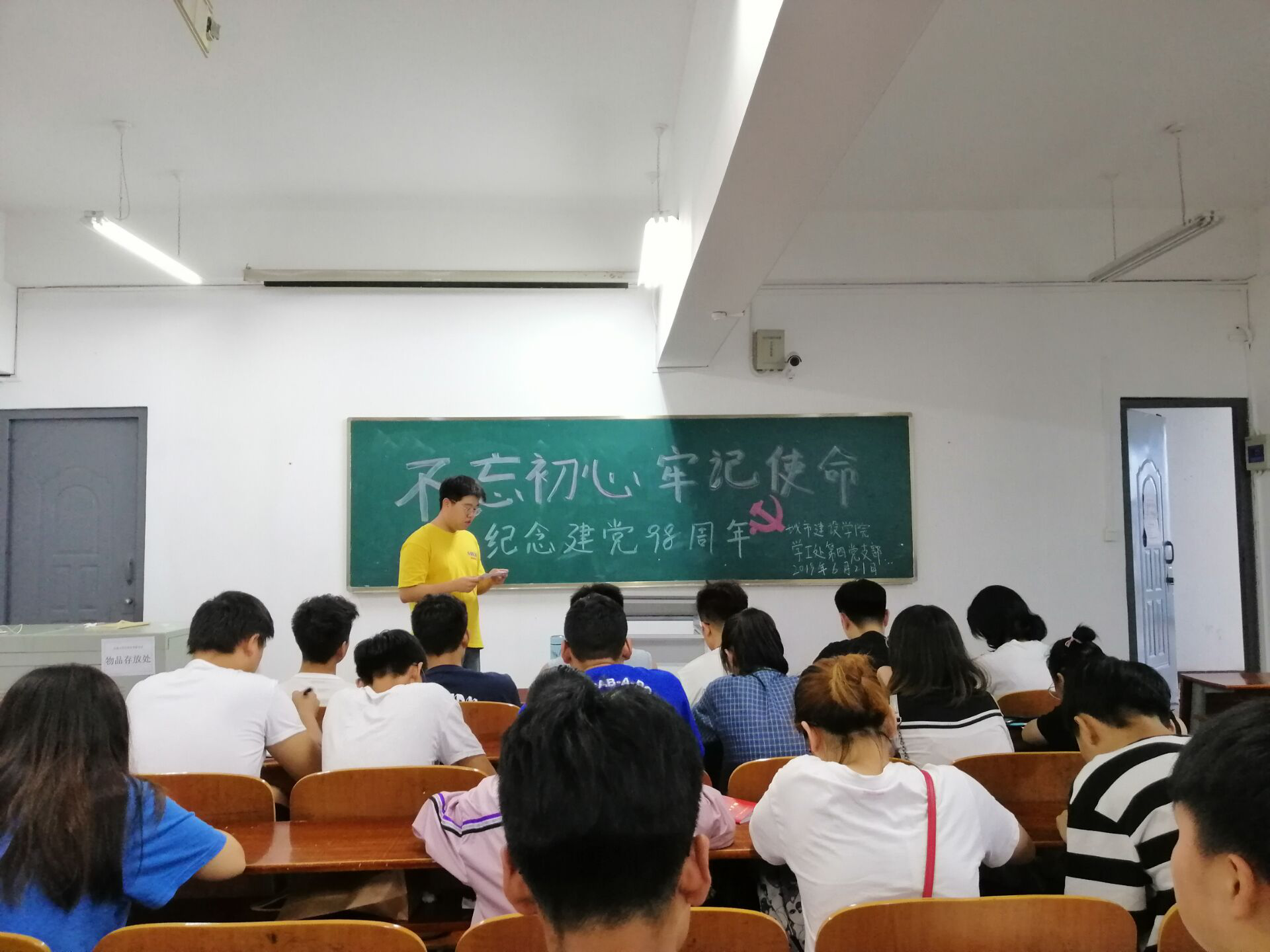 会议伊始,工造1603班的孙振宇带着大家学习新时代精神以及习近平新时代中国特色社会主义思想,重温入党誓词,学习革命先烈们坚守理想、传承信仰的优良品质,舍小家、顾大家的革命斗争精神和勤俭节约的生活作风,教育同志们坚定信仰,不忘初心,永远跟党走。接着造价1601班的曾卓在不忘初心中讲到自己的初心是回乡创业,家乡有个工业园,也有好多名牌大学生在创业。工程造价1802班陈飞飞讲到党历史发展的几个阶段。最后,孙振宇讲到毛泽东的例子,希望大家要学习毛泽东,不畏艰难,而且希望大家要以党员的规范严格要求自己。