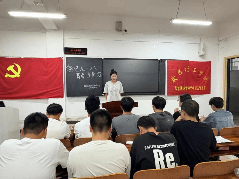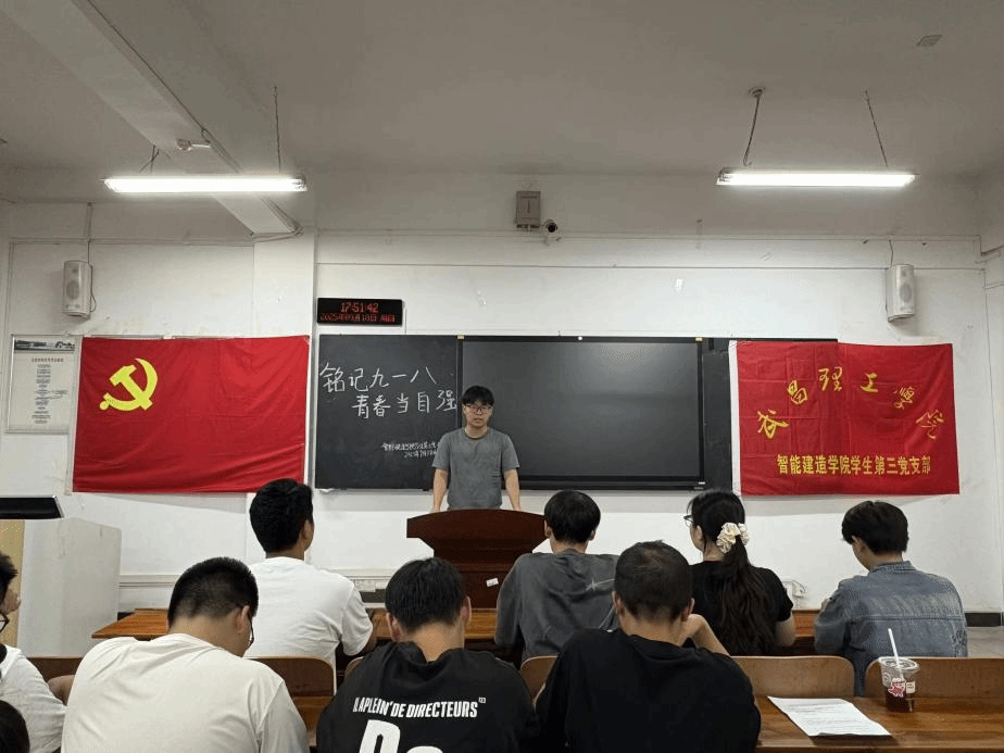 (智能建造学院第三党支部 孟昌熙 报道)在“九·一八”事变爆发94周年之际,为深入学习贯彻习近平新时代中国特色社会主义思想,持续推动党史学习教育常态化长效化,2025年9月18日晚上17:40智能建造学院学生第三党支部在智能建造学院409教室开展以“铭记‘九·一八’,青春当自强”为主题的红色故事分享会。