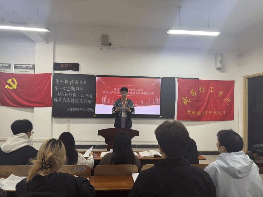 (智能建造学院党总支 阮靖皓 报道)预备党员处于“预备”向“正式”过渡的关键阶段,在智能建造行业加速绿色化、智能化转型的新形势下,深化对共产党员标准的时代认知、主动扛起先锋模范责任,是锤炼党性修养、履行党员义务的核心要求。为引导第30期预备党员精准把握新形势下党员标准的内涵要义,找准发挥先锋作用的实践路径,2025年10月25日18:00,武昌理工学院智能建造学院第30期预备党员党校培训班第一次主题讨论在智能建造学院410教室举行,讨论主题聚焦“新形势下如何认识与践行共产党员标准,发挥党员先锋模范作用”。参加此次的主题讨论的成员有第30期预备党员培训班成员和智能建造学院党总支党务助理。