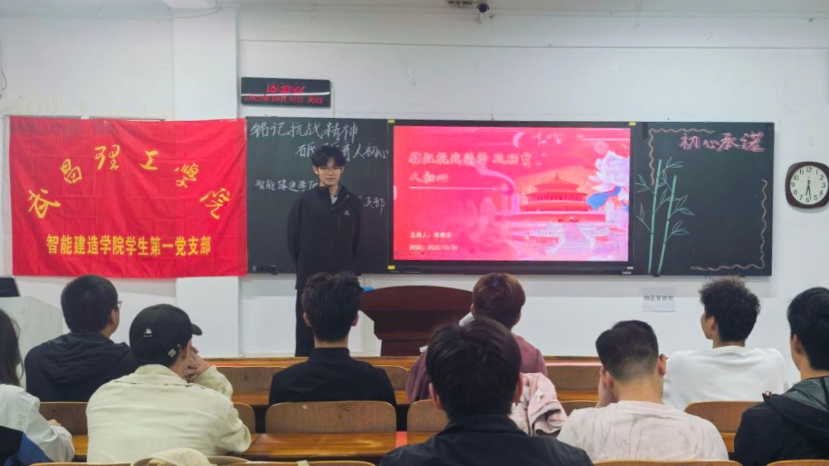 (智能建造学院学生第一党支部 李梦佳 报道)为传承红色基因、凝聚奋进力量,深入学习贯彻爱国主义精神,智能建造学院学生第一党支部于2025年10月30日18时30分在智能建造学院409教室开展"铭记抗战精神,砥砺育人初心"主题活动。智能建造学院学生第一党支部部分成员参与本次活动,由土木工程2401班李果洋同志担任主持人。