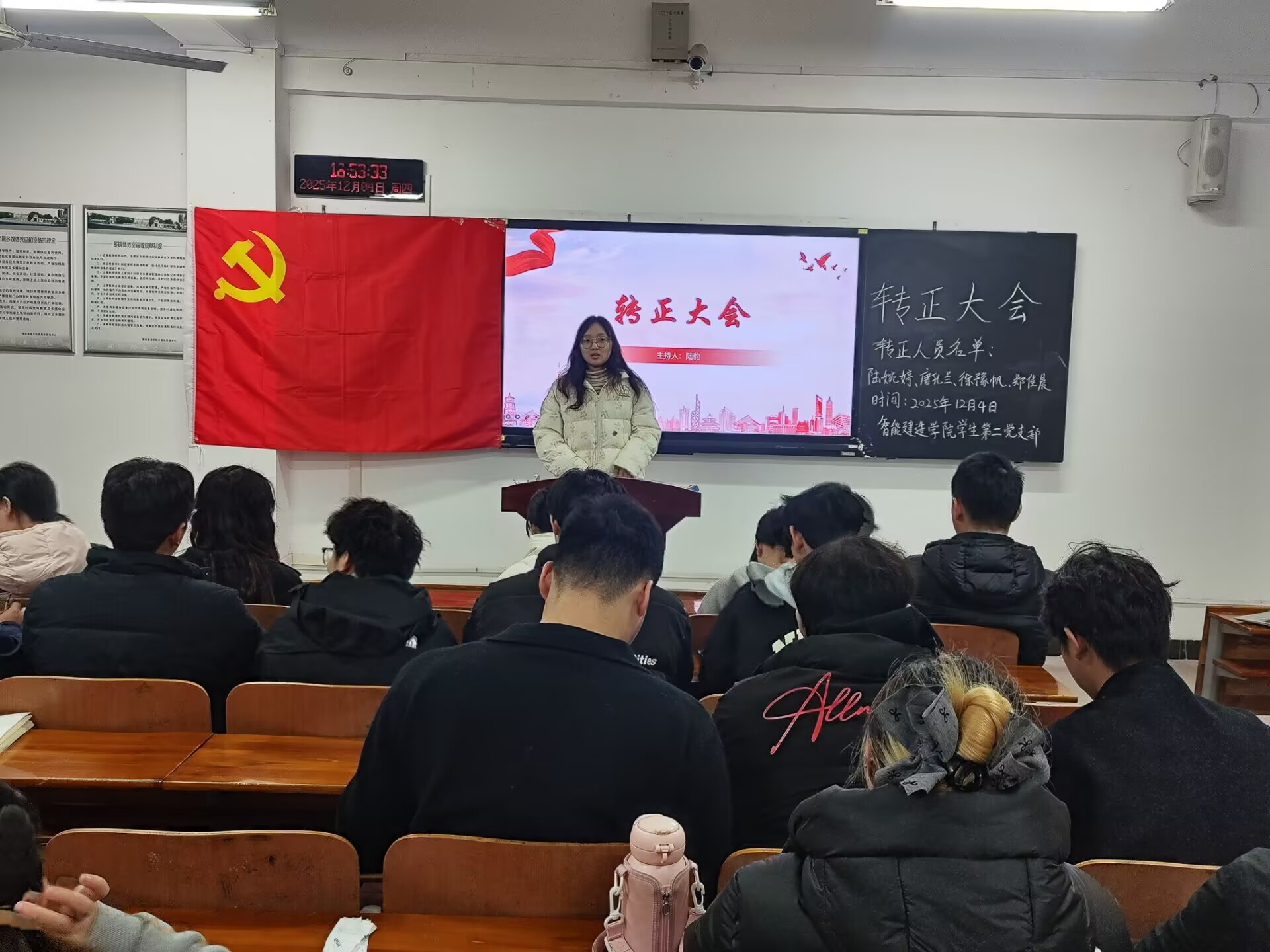 (智能建造学院学生第二党支部 诸露浩 报道)2025年12月4日18时50分,智能建造学院411教室内座无虚席、气氛庄重,智能建造学院学生第二党支部转正大会在此隆重举行。此次大会不仅是支部组织建设的关键节点,更是夯实党建根基、强化党员使命担当、推动支部事业薪火相传的重要契机,对凝聚青年党员力量、以高质量党建引领专业发展意义深远。