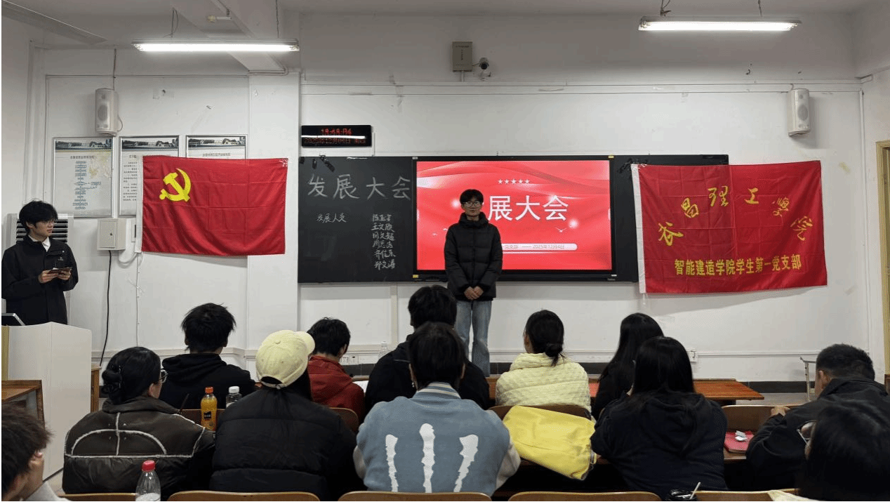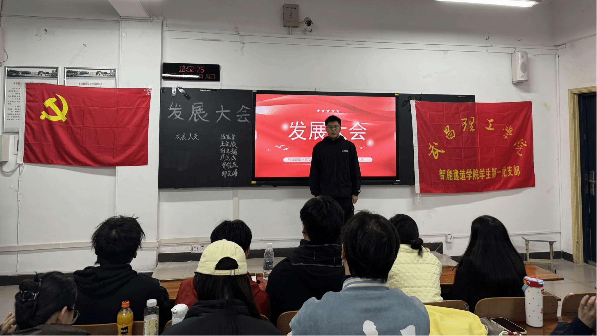 (智能建造学院学生第一党支部 李果洋 报道)为加强基层党组织建设,切实做好党员发展与教育工作,2025年12月4日晚6时30分,智能建造学院学生第一党支部在智能建造学院408教室召开接收预备党员发展大会。会议由土木工程2401班李果洋同志主持。智能建造学院党总支秘书、学生第一党支部书记皮家凤,智能建造学院学生第一党支部全体党员参会,共同审议陈正宇、王文欣、闵文超、周思洁、齐佳乐、郑文涛6位发展对象的确定事宜。