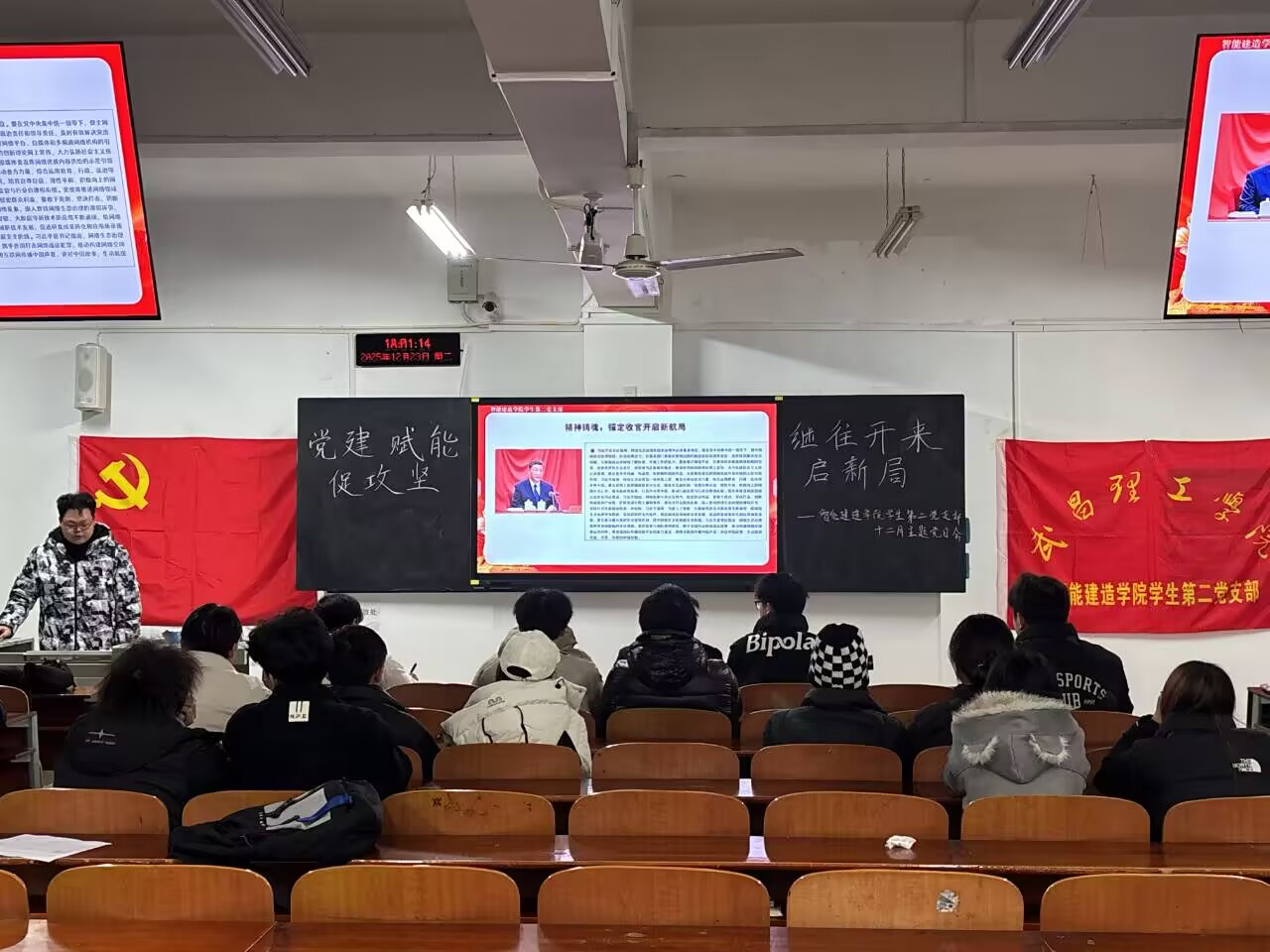 (智能建造学院学生第二党支部 汤阳 报道)为深入学习贯彻 “十四五” 规划收官与 “十五五” 规划开局的战略部署,引导高校党员深刻把握时代使命,以实际行动践行 “国之大者”,2025年12月23日18时,智能建造学院学生第二党支部在智能建造学院514教室召开 “党建赋能促攻坚,继往开来启新局” 主题党日会。