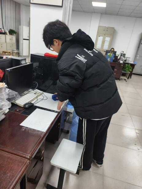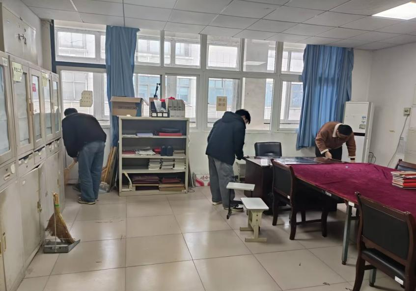 活动中,智能建造学院学生第一党支部、第二党支部、第三党支部的12名同志分工协作,对学院办公楼、教学楼近20个功能区域展开"地毯式"清洁。在401会议室、419会议室等公共区域,志愿者们仔细擦拭桌椅、整理物资,确保会务环境整洁有序;在420专家接待室、422教学院长办公室等重点场所,党员们轻手轻脚、细致入微,以高标准完成清扫任务;针对425学院档案室、502党务档案室等资料密集区域,志愿者们分类整理文件、清除积尘,守护学院历史资料的完整与安全。