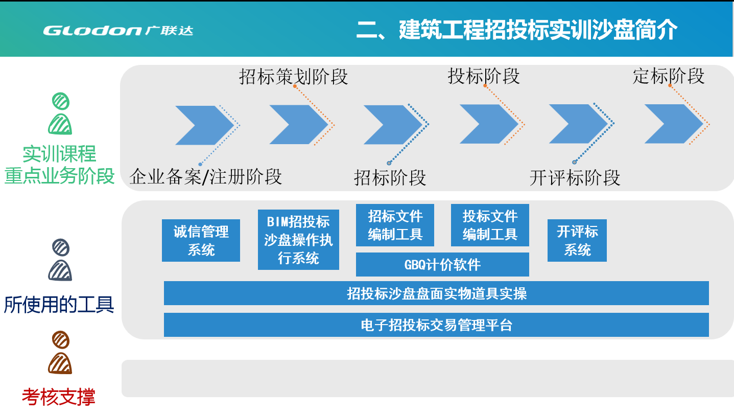建筑工程招投标实训沙盘是面向工程造价、工程管理、建筑工程技术等专业学生,强化工程招投标专业实践应用能力,培育和提升招标采购专业人员“取道谋术、德才兼备”的工程招投标市场实战模型,该沙盘以建筑工程招投标专业理论为导入,集结了招投标利益相关各方精英团队,以军事兵棋推演的形式,通过一系列故事化情节,全面再现了工程招投标全过程的博弈对决,尤其突显了招标方与投标方之间、投标方相互之间决策博弈、手段博弈、利益博弈、品性博弈的市场竞争态势,是招投标利益相关各方实现各自利益最大化的博弈培训专用教具。