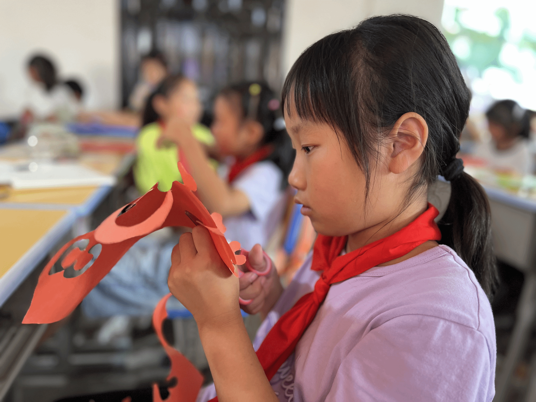 夕阳为少年宫披上金纱,孩子们紧握剪纸作品不舍离去。本次课程远不止于技艺传授:环保课程埋下绿色种子,魔法信箱守护情感萌芽,专注力训练筑基学习能力,而剪纸课更将文化自信刻入童年记忆。郑琦老师在接受采访时表示:“我们要点燃三盏灯——剪纸课是发现身边瑰宝的传承之灯,魔法信箱是照见内心的成长之灯,专注力游戏则是启迪未来的希望之灯。乡村教育不仅需要知识传递,更需要唤醒生命的无限可能。”离去的背影渐行渐远,剪纸上的金鱼却在暮色中愈发鲜亮。这些游弋于纸端的祥瑞,恰似志愿者们播撒的火种:今日衔福入童心的金鱼,终将在岁月长河中化为星汉,照亮乡村振兴的迢迢征途。
