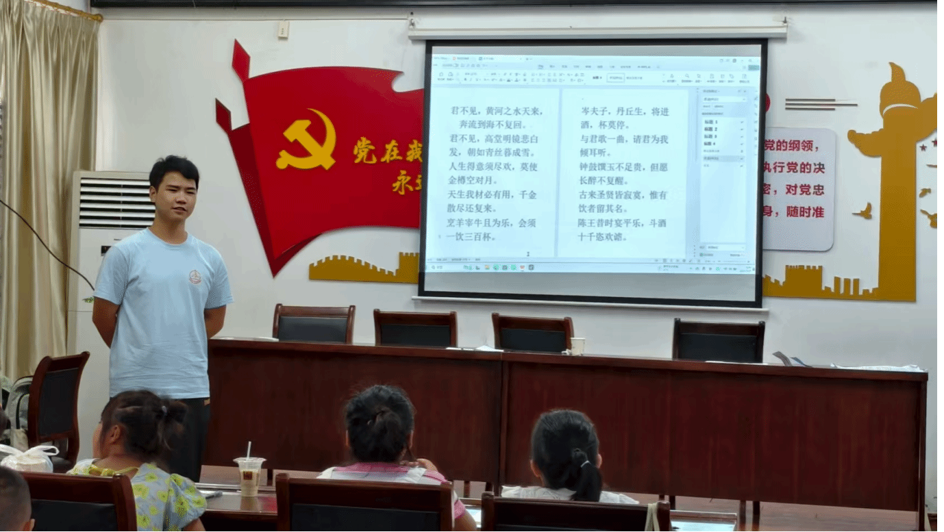 团委网7月23日消息(通讯员 李晓彬 报道 齐佳乐 许翊辰 摄影)为响应国家加强美育教育、弘扬中华优秀传统文化的号召,落实“七彩假期”项目丰富乡村儿童精神文化生活的具体要求,7月21日,武昌理工学院“灯塔计划”心爱筑梦公益团队在湖北省当阳市玉泉街道干河村,为当地儿童带来一堂别开生面的《琵琶行》诗乐课堂。团队成员梅鹏杰创新采用“诗乐融合”教学法,让千年古诗在旋律中焕发新生,为乡村文化振兴增添了生动实践。