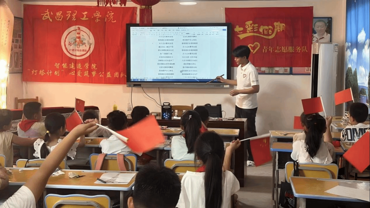 团委网7月20日消息(通讯员 李果洋 报道 张跃凡 刘若曦 摄影)为响应“三下乡”志愿服务号召,引导青年大学生在社会课堂中“受教育、长才干、作贡献”,将爱国主义的种子深植青少年心田,7月20日,武昌理工学院“灯塔计划”心爱筑梦公益团队在共青团当阳市委的支持下,深入当阳市庙前镇郑琦乡村少年宫,精心组织“国旗在我心中”爱国教育课程。团队成员许翊辰担任主讲,为孩子们带来这堂生动的爱国教育课。