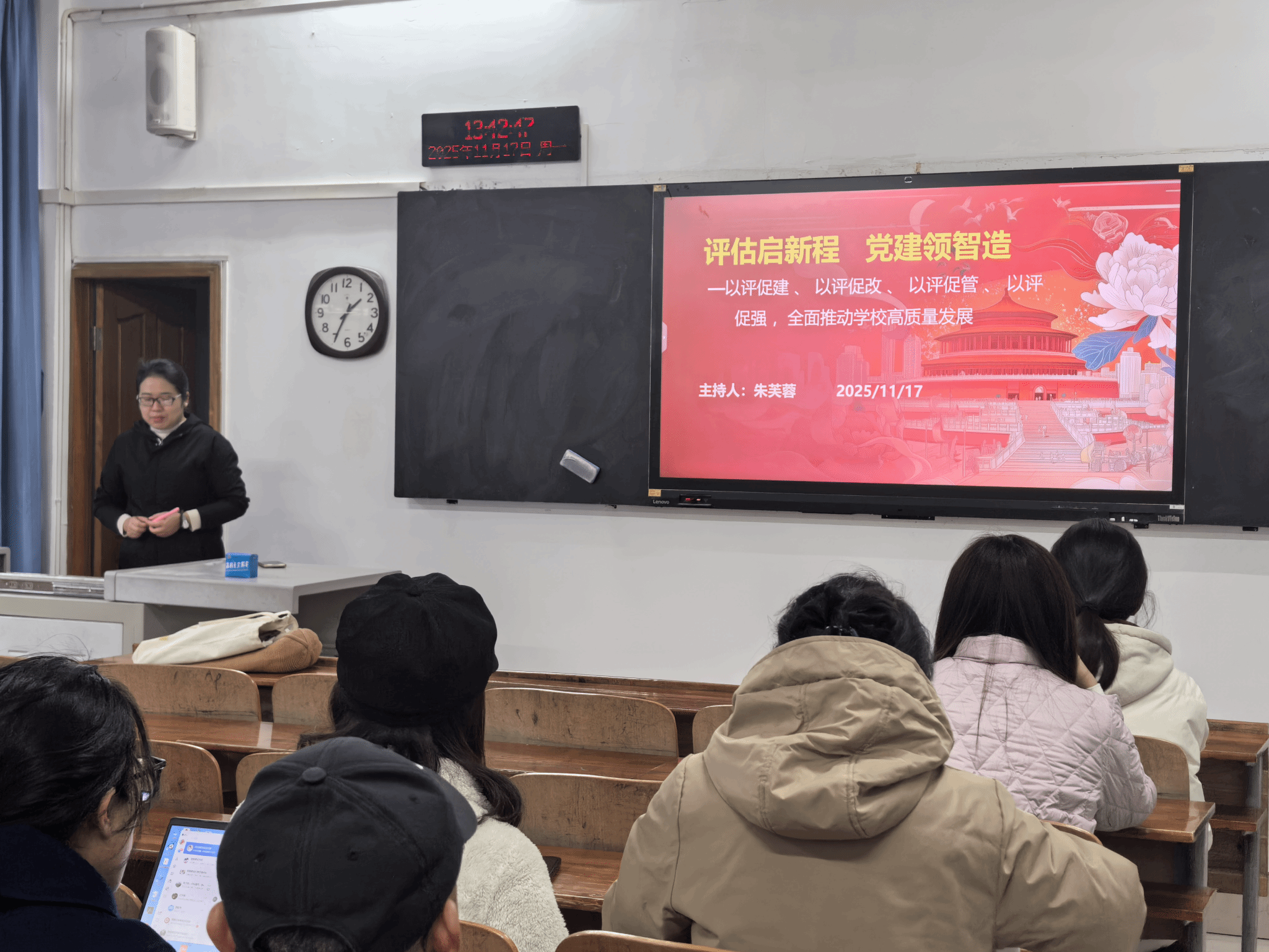 领学环节中,段玲燕老师围绕党的二十届四中全会关于 “加快建设现代化产业体系、推动新质生产力发展” 的部署要求,结合智能建造行业发展趋势展开系统解读。她指出,智能建造作为住建领域新质生产力的核心动力,其本质是通过数字化、工业化、智能化技术实现 “降本增效、本质安全” 的发展目标,这与全会提出的 “统筹发展和安全” 理念高度契合。段老师结合 BIM 技术应用、智能施工安全监测、建筑机器人运维等专业场景,详细阐释了如何将全会精神融入课程思政改革、实践教学创新及科研项目攻关,引导教职工深刻把握 “学思用贯通、知信行统一” 的学习要求。