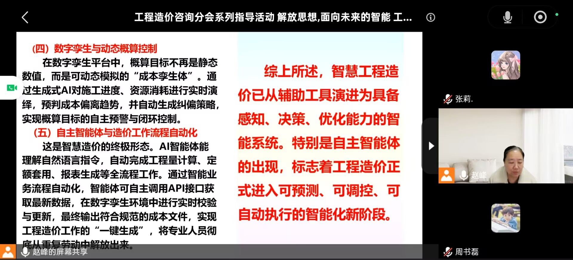 团委网12月10日消息(通讯员 汤阳 报道)为精准对接行业智能化转型需求,助力广大校友把握职业发展新机遇,智能建造学院于12月10日晚以线上会议形式成功举办工程造价咨询分会系列指导活动。本次会议以“解放思想,面向未来的智能工程造价人才场景创新”为主题,由校友工作负责人周书磊老师主持,智能建造学院工程造价系主任赵峰担任主讲嘉宾,院长柳立生、党总支书记王杰出席。学院领导、各系主任、专业教师代表及工程造价咨询分会校友齐聚云端,共话行业变革与人才成长新路径。