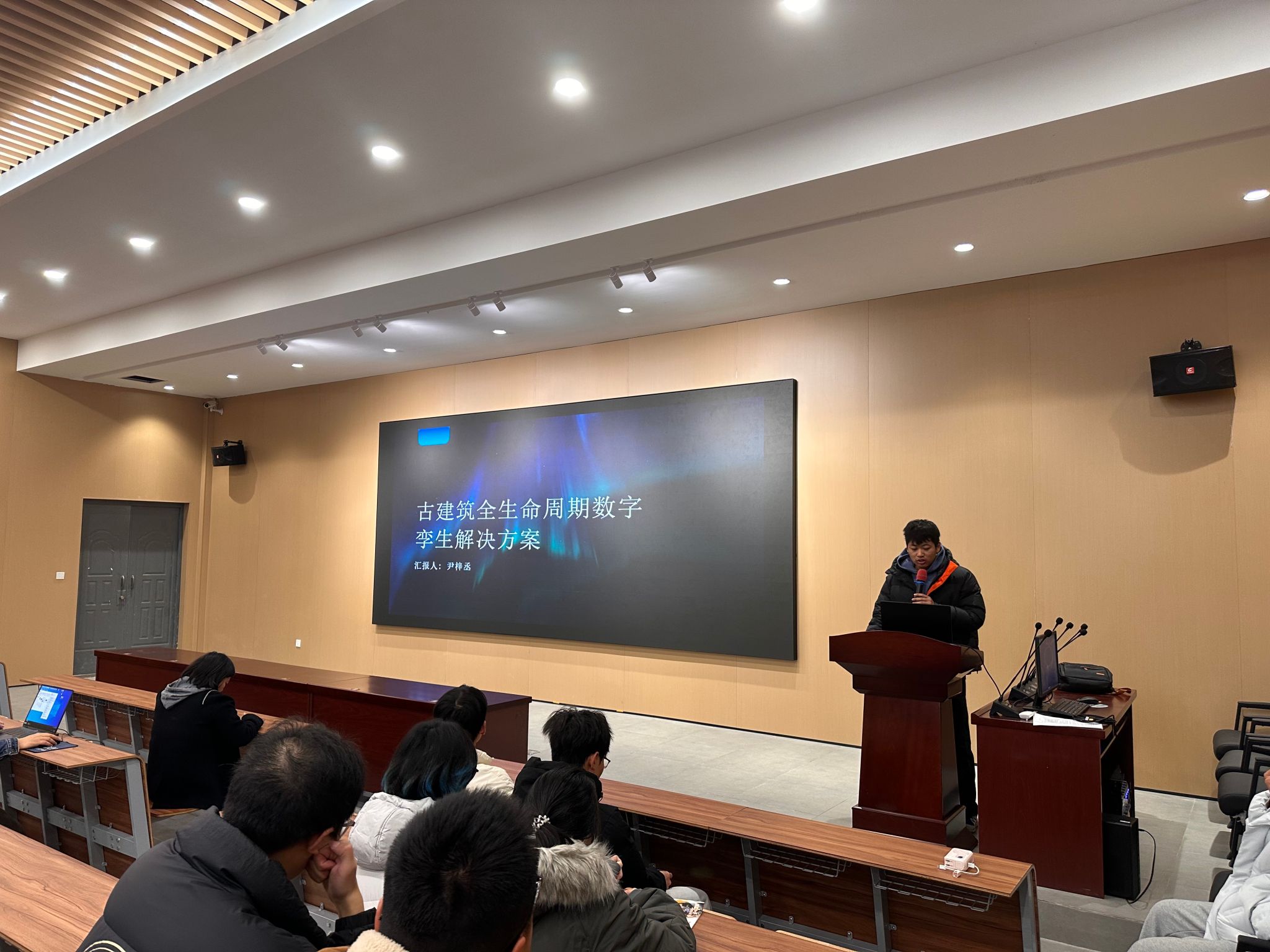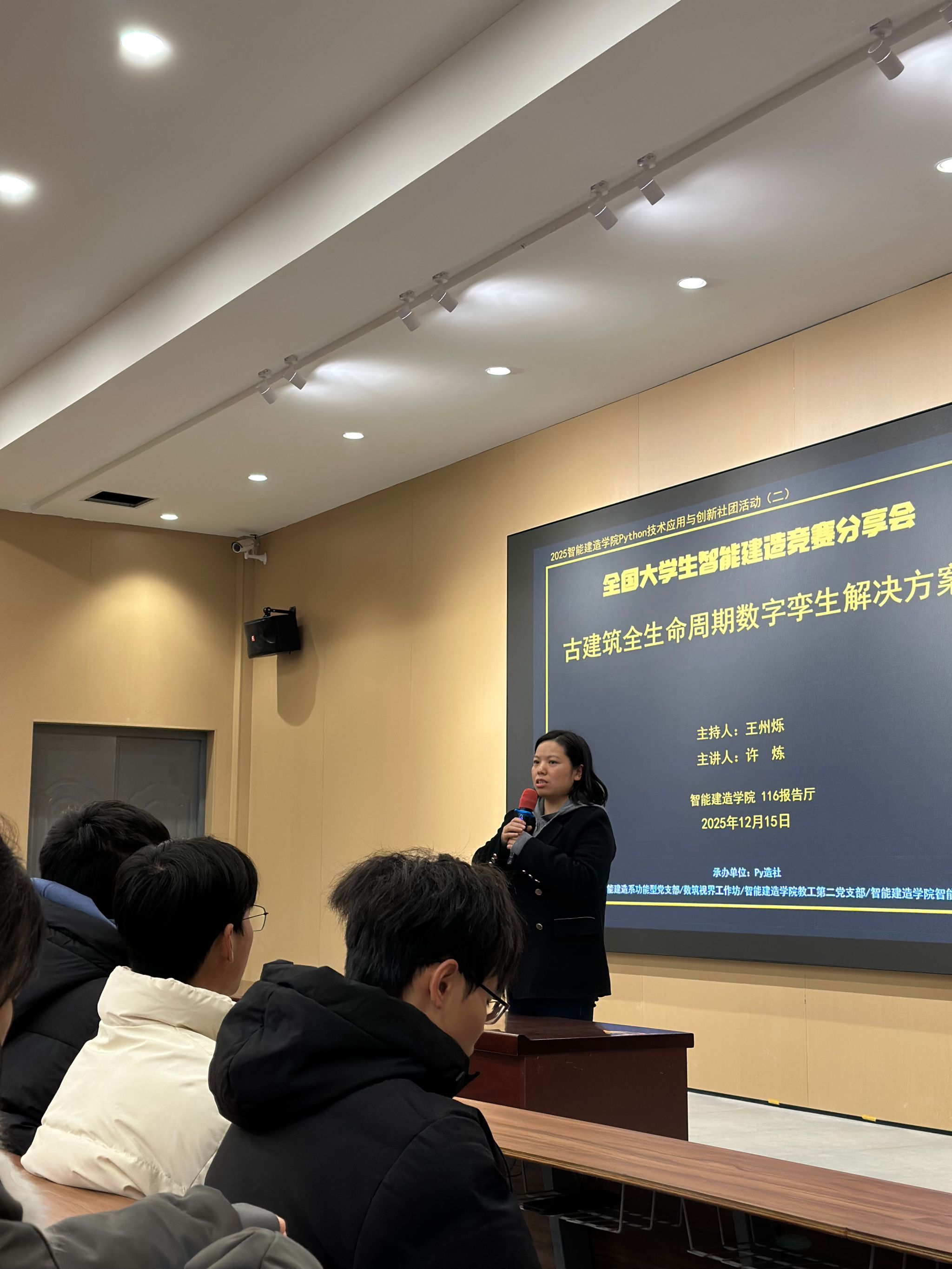 在学生成果分享环节,尹梓丞同学带来了首届全国智能建造比赛的参赛经验与心得交流。作为在12月举办的首届全国智能建造比赛中斩获二等奖的优秀选手,尹梓丞同学详细介绍了其参赛作品《古建筑保护全生命周期方案》的核心内容。他表示,该方案聚焦古建筑这一珍贵文化遗产的保护需求,深度融合AI与BIM建模技术,构建了涵盖古建筑数字化采集、损伤智能检测、预防性修缮规划、长效运维管理的全流程解决方案,为古建筑保护与活化利用提供了兼具技术性与实用性的创新路径。分享中,尹梓丞同学还讲述了参赛过程中的团队协作经历、遇到的技术难题及解决思路,强调了理论知识与实践结合的重要性,为在场同学参与学科竞赛提供了宝贵的经验借鉴。