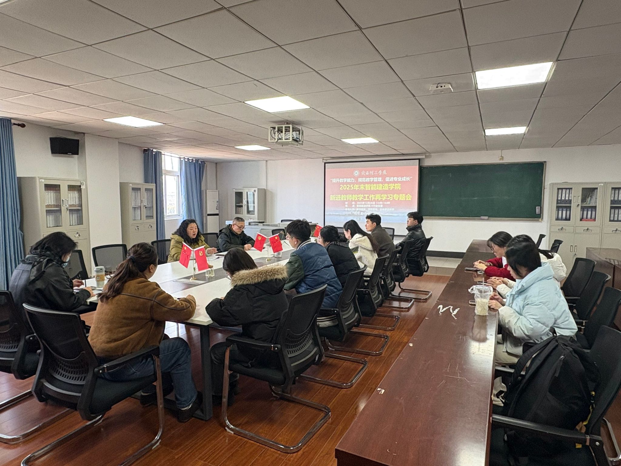 12月26日13:00,智能建造学院在419会议室成功举办了“新进教师教学工作再学习专题会”。本次会议旨在提升新进教师的教学能力,规范教学管理,促进教师的专业成长。会议由汤菲、王刚、苏卿三位发言人主持,参会人员包括雷芸芸、荣辉阳、韩松洁、文园园、涂正隆、王艺萤、周玉琪、麻浩、丁辛宇、王馨玉、明曌多位教师。