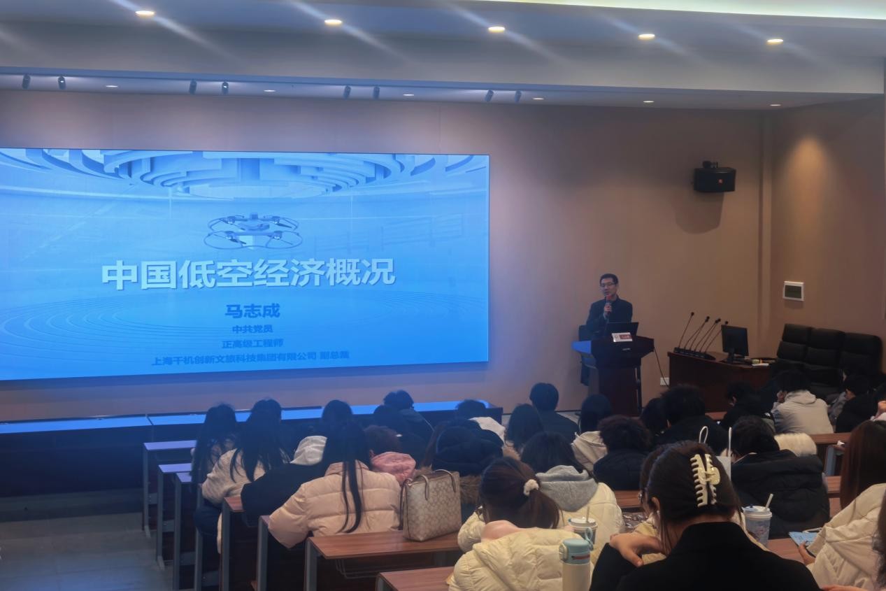 会后,上海千机创新集团副总裁马志成高级工程师为师生作了《中国低空经济概况》专题报告,展示了2025年行业产值近3000亿、增长超40%的蓬勃态势。